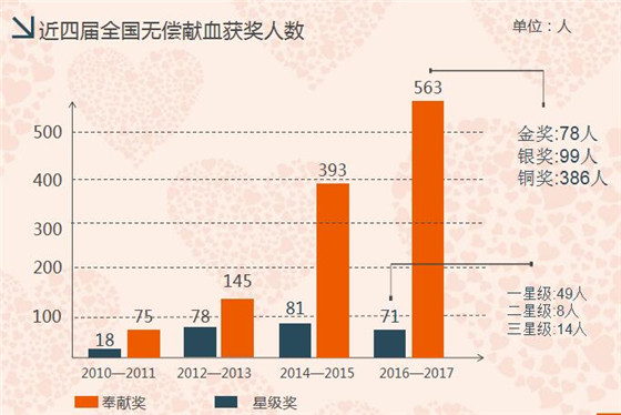2016至2017年度安康申報全國獲獎人數634人次,其中:無償獻血奉獻獎計563人,金獎78人,銀獎99人,銅獎386人 ;全國星級志愿服務獎71人,一星級49人,二星級8人,三星級14人。連續(xù)五屆十年榮獲全國無償獻血先進城市;安康職業(yè)技術學院被評為全國無償獻血促進獎單位;我站站長胡章學被評為全國無償獻血促進獎個人。獲獎人數創(chuàng)歷史新高。