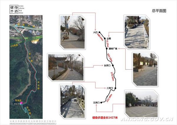 項目實施地點為安康市香溪洞風景區(qū)原有健身步道(水泥路面),北起香溪文化廣場南側,南至香溪洞景區(qū)停車場,全長約1.5公里,寬度介于2.47—3.72米之間。