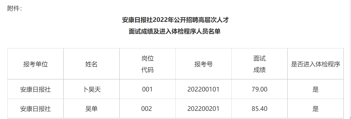 根據(jù)《安康日報社2022年公開招聘高層次人才公告》規(guī)定,現(xiàn)將安康日報社2022年公開招聘高層次人才面試成績及進入體檢程序人員名單(見附件)、體檢有關(guān)事項,公告如下:
