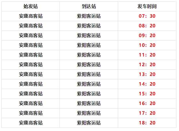 由安康高速客運站發(fā)往紫陽汽車站,每日12班,發(fā)車時間為:?