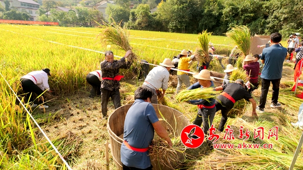 穗滿田頭谷滿倉,稻魚飄香慶豐年。稻田里,緊張激烈、歡快熱鬧的割稻、甩谷及釣魚比賽正在進(jìn)行,只見一株株水稻隨著鐮刀的刷刷聲倒下,一把把稻穗隨著摔打脫落為金色的谷粒,一條條稻魚在手中躍動(dòng),大家爭分奪秒、你追我趕,一派熱火朝天的景象。