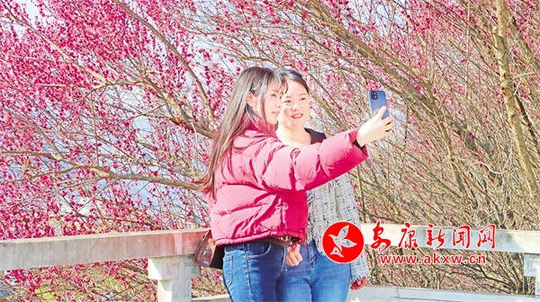 石泉縣濱江大道上紅梅競相綻放,廣大游客駐足觀看,打卡留念。譚文昌 攝?