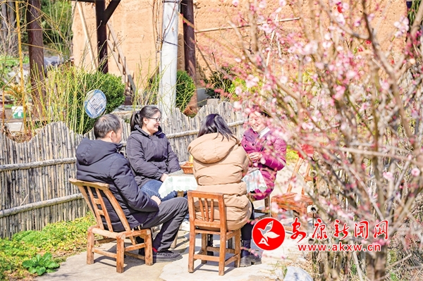 在漢陰縣蒲溪鎮(zhèn)芹菜溝村的芹源農(nóng)莊,游客賞花品茶。王建霞 攝
