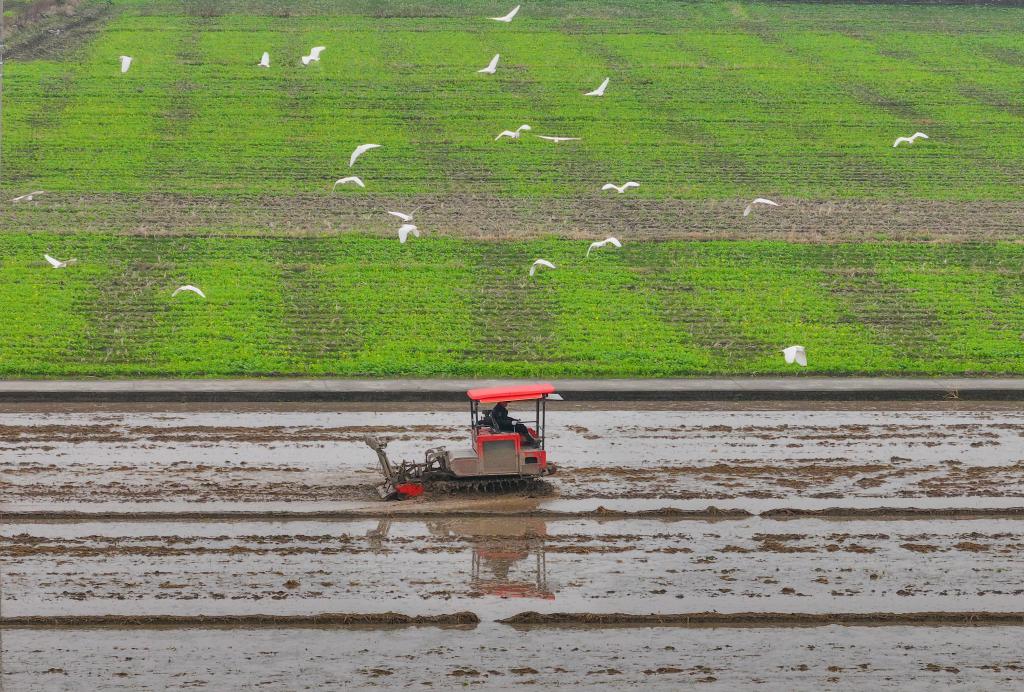 2月25日,在浙江省瑞安市馬嶼鎮(zhèn)儒陽村,農(nóng)機在田間犁地,白鷺低空而飛(無人機照片)。早春時節(jié),各地農(nóng)民搶抓農(nóng)時,開展春耕、春管等農(nóng)事活動,田間地頭到處是一派人勤春早的忙碌景象。 新華社發(fā)(蘇巧將攝)