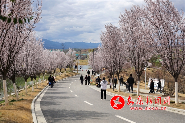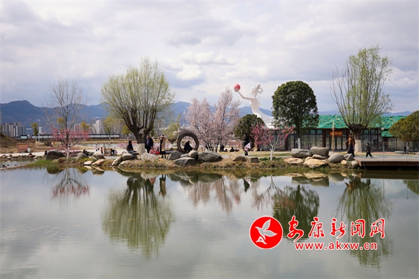 景區(qū)紫葉李、桃花競相綻放,吸引市民前往觀賞。