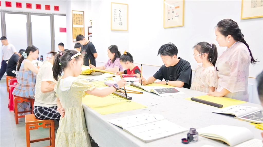 “我們來看下這‘?!郑亲笥医Y(jié)構(gòu)的字,左邊的偏旁是一個三點(diǎn)水,三點(diǎn)水寫的時候要注意連貫性……”書法老師細(xì)致地拆解著漢字的書寫技巧,耐心指導(dǎo)著現(xiàn)場的每一位學(xué)員。