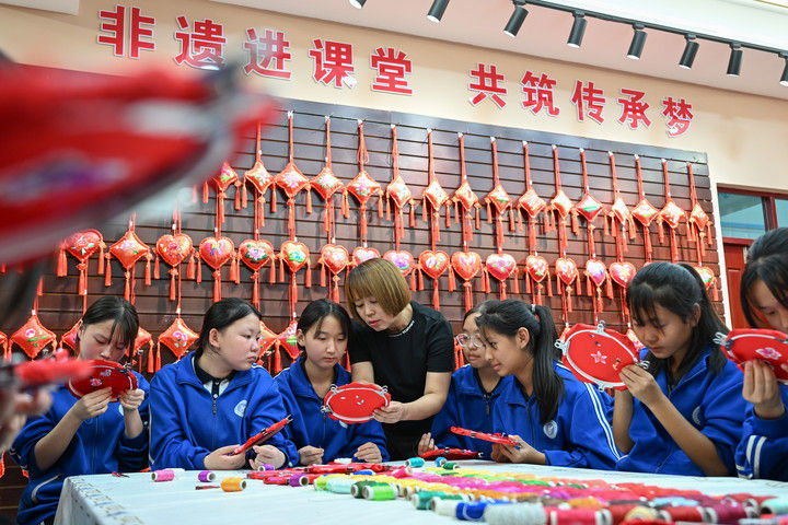 2025年9月26日,內蒙古興安盟科右中旗巴彥呼舒第六中學美術教師、非遺代表性傳承人吳斯琴(左四)指導學生刺繡。近年來,內蒙古興安盟科爾沁右翼中旗巴彥呼舒第六中學將當?shù)貒壹壏沁z圖什業(yè)圖刺繡引入校園,開設校本課程,并成立興趣社團,在豐富校園文化生活的同時,讓學生們近距離感受非遺的魅力,弘揚和傳承中華優(yōu)秀傳統(tǒng)文化。