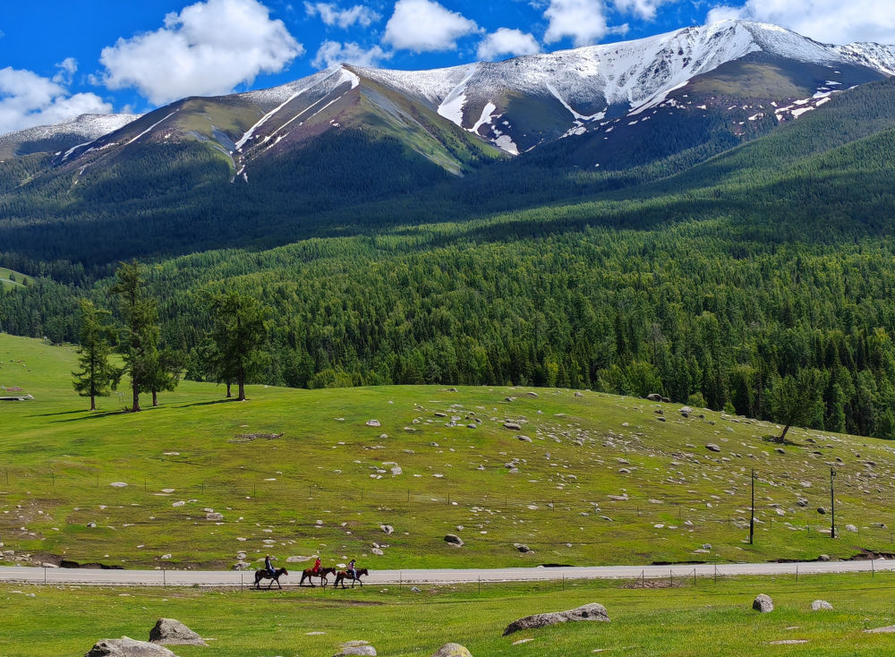 2024年6月4日,游客在新疆阿勒泰地區(qū)哈巴河縣騎馬游玩。電視劇《我的阿勒泰》播出后,新疆阿勒泰地區(qū)迎來客流高峰,“張鳳俠的小賣部”“巴太樹”“彩虹布拉克”等劇中地點(diǎn)成為熱門旅游打卡地。這場“邊城”與“熱劇”雙向奔赴的文旅盛宴,為當(dāng)?shù)亟?jīng)濟(jì)發(fā)展帶來新的增長點(diǎn)。2024年5月,當(dāng)?shù)亟哟慰?15.03萬人次,同比增長60.81%;實(shí)現(xiàn)旅游收入36.53億元,同比增長88.25%。