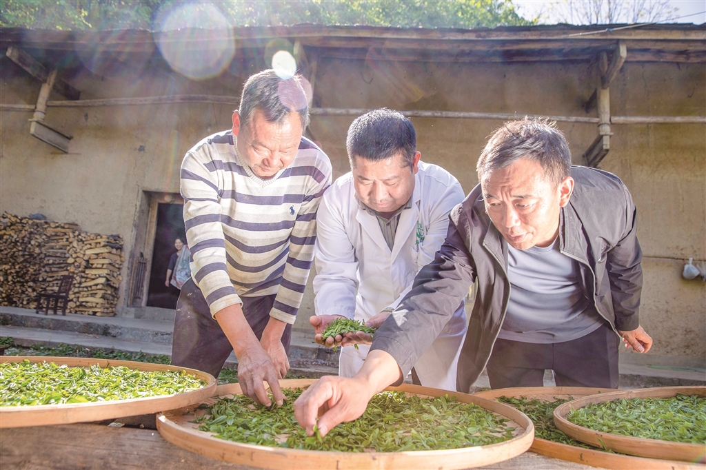 “十四五”期間,我市持續(xù)推進茶產(chǎn)業(yè)發(fā)展,努力實現(xiàn)茶產(chǎn)業(yè)“四時有收”。圖為紫陽白茶非遺制作技藝代表性傳承人在高橋鎮(zhèn)裴壩村,向茶農(nóng)推廣紫陽白茶非遺制作技藝。