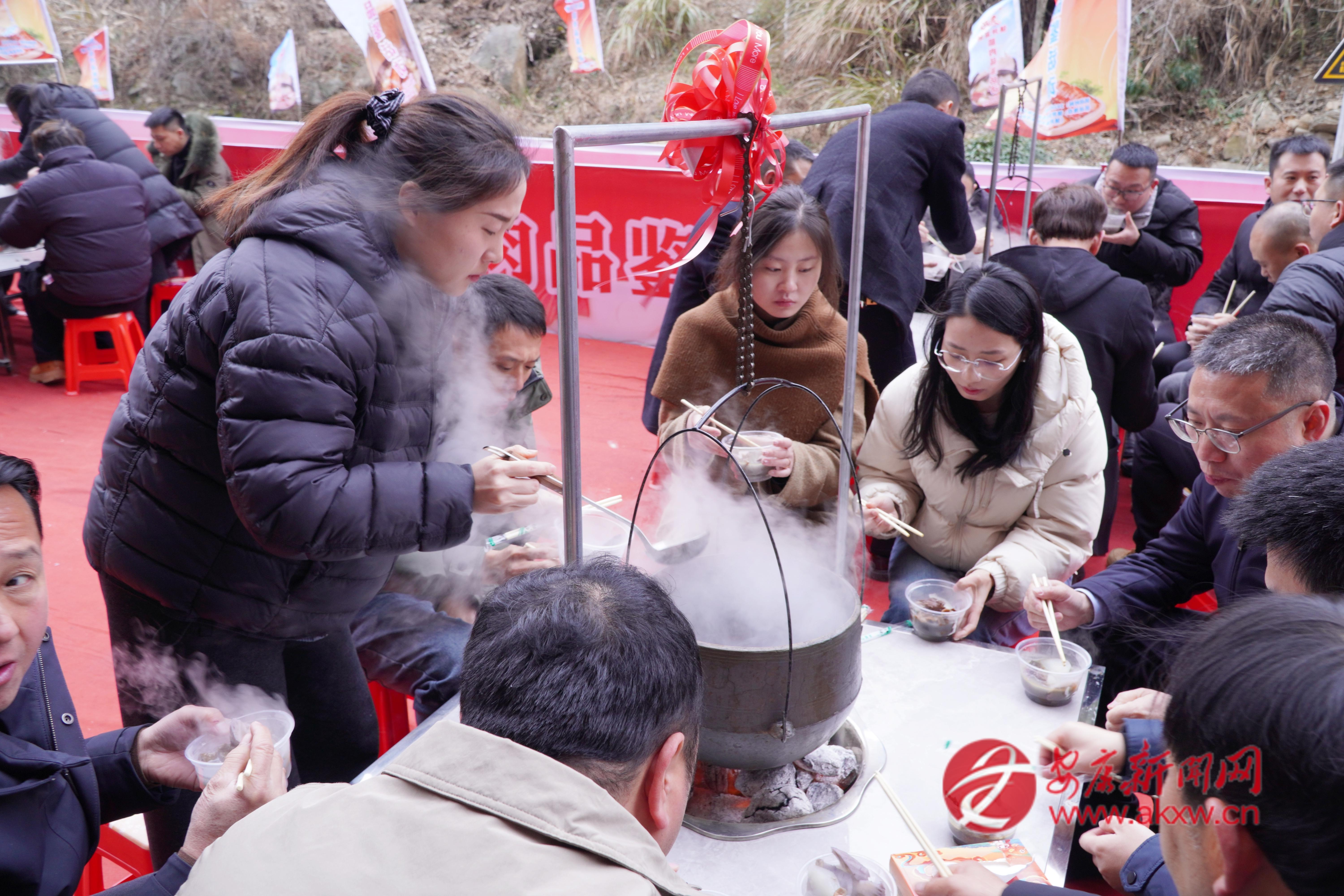 活動現(xiàn)場,一口巨型大鐵鍋格外引人注目,它可以燉500斤肉,可供1000人同時品嘗鎮(zhèn)坪富硒臘肉。同時,20個吊鍋中,臘肉與香菇、竹筍、干洋芋果果一同燉煮,香氣四溢,讓人垂涎欲滴。賓客們圍坐一起有說有笑,品嘗著可口地道的鎮(zhèn)坪臘肉,不僅是一場臘肉美食的集會,更是一種非遺技藝的傳承?!霸缇吐犝f陜南鎮(zhèn)坪的富硒臘肉有名,這次專程趕來,就為這一口地道的臘味,品嘗后覺得這臘肉的味道太美了!”在活動現(xiàn)場,一位來自西安的游客李先生在品嘗鎮(zhèn)坪臘肉后高興地說道。