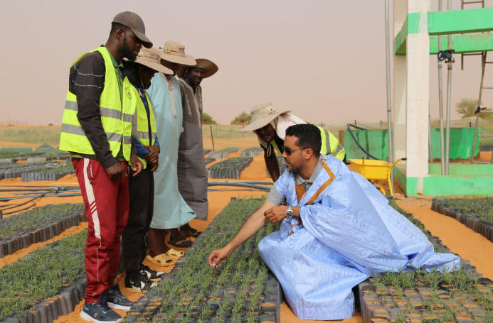 2025年5月22日,在毛里塔尼亞西部特拉扎區(qū)比爾·巴爾卡村,中非綠色技術公園毛里塔尼亞示范項目毛方協(xié)調(diào)員圖拉德·邁杜向工人傳授固沙植物種植技術。新華社記者 司源 攝