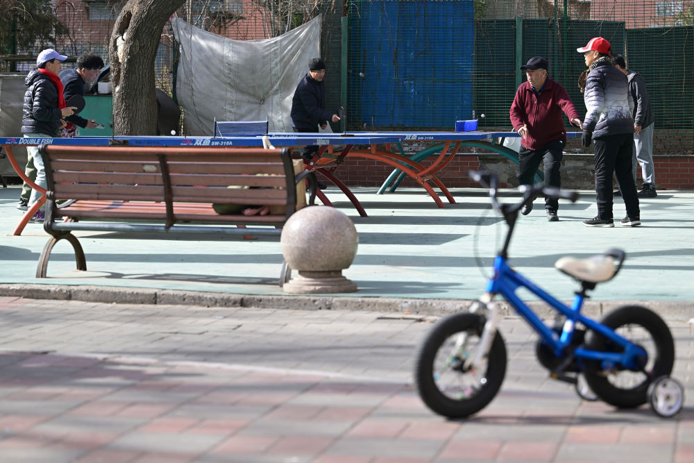 社區(qū)內(nèi),利用樓群間空地設置的乒乓球臺等健身設施為附近的老年居民提供了便捷的健身場所(2月10日攝)。