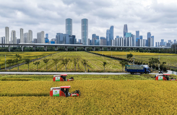 收割機在位于浙江杭州蕭山區(qū)世紀(jì)田園糧食功能區(qū)的稻田里收割水稻,遠(yuǎn)處高鐵列車飛馳而過(2025年10月21日攝,無人機照片)。新華社記者 徐昱 攝