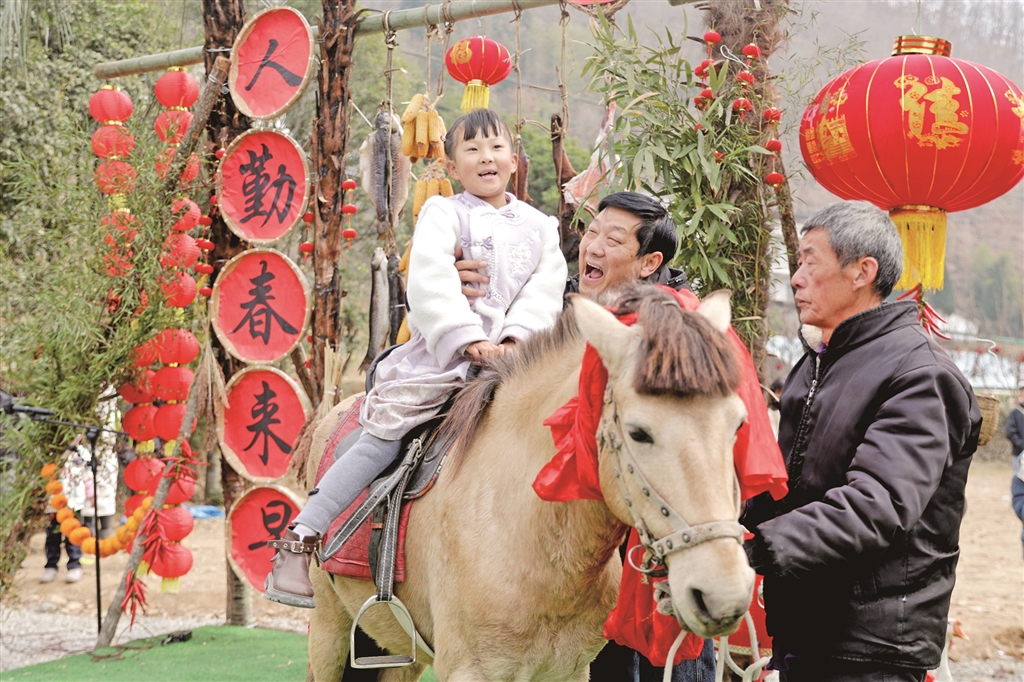 春節(jié)期間,寧陜縣城關(guān)鎮(zhèn)漁灣村舉行“回寧陜過大年”民俗展演。圖為游客體驗?zāi)晁谆顒印顚?攝